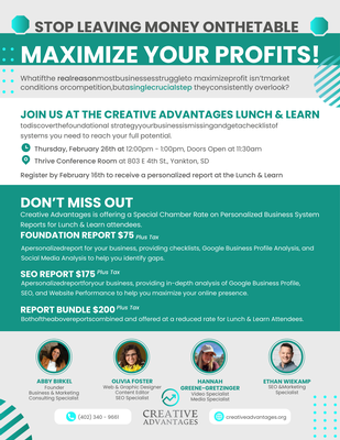 Creative Advantages is offering a Special Chamber Rate on Personalized Business System Reports for Lunch & Learn attendees.