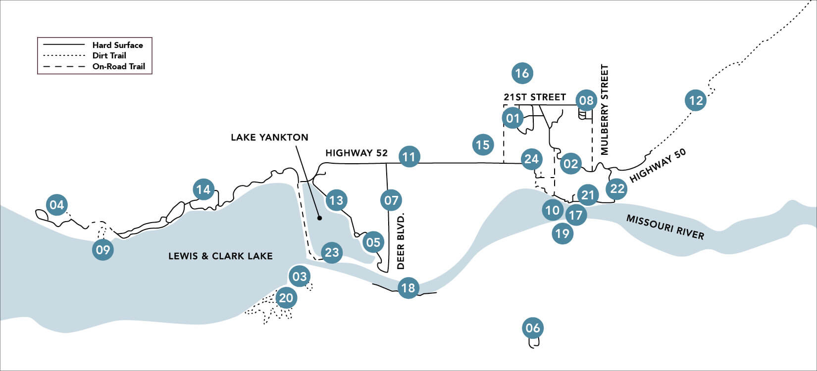 The City of Yankton and the adjacent lake area have a myriad of excellent hiking and biking trails. The Auld-Brokaw Trail runs through the entire city and actually connects to the trail out to Lewis and Clark Lake. From there the trails continue to run through the state recreation area. There are number of primitive hiking trails at Lewis and Clark Recreation Area, as well as a horse trail.